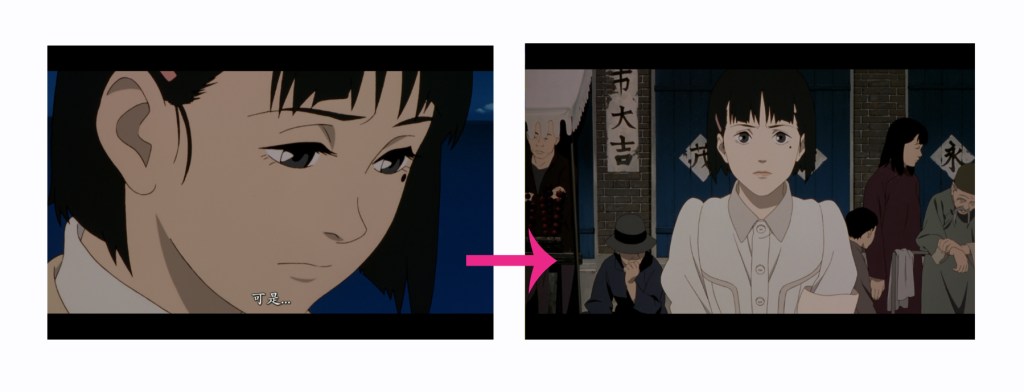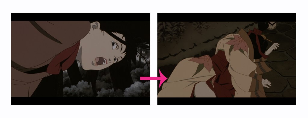 En “Millennium Actress”, el plano es que Chiyoko tropezó en la cadena, en aquí está desempeñando una asesina. Luego, el siguiente plano es que Chiyoko cayó a tierra, en aquí está desempeñando una geisha. Kon satoshi encadenado dos dramas muy bien.