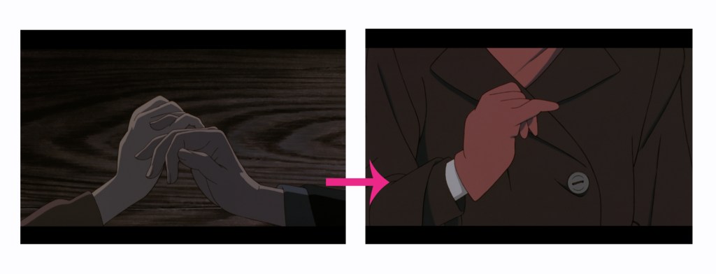 El plano es que la mano de Mima está abriendo la puerta de la casa, el siguiente plano se ha transformado en que Tadokoro abriendo la puerta de la empresa.