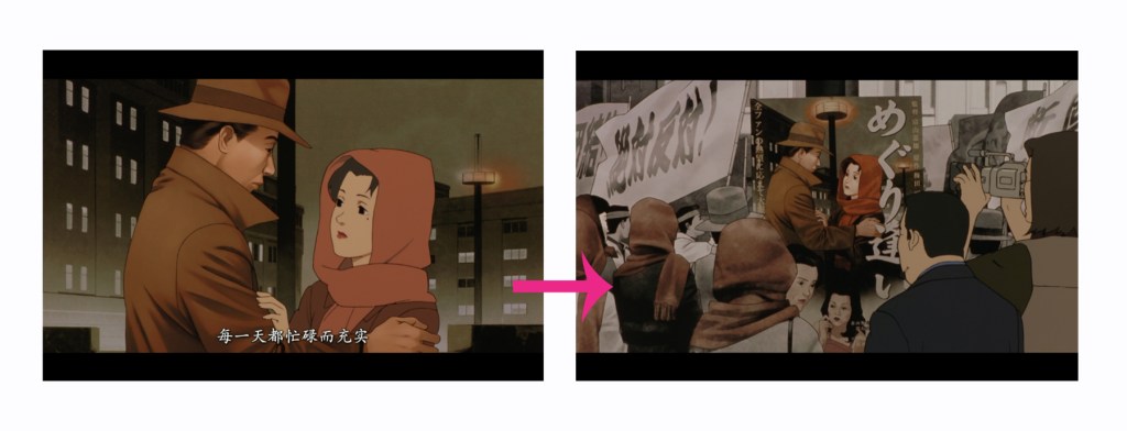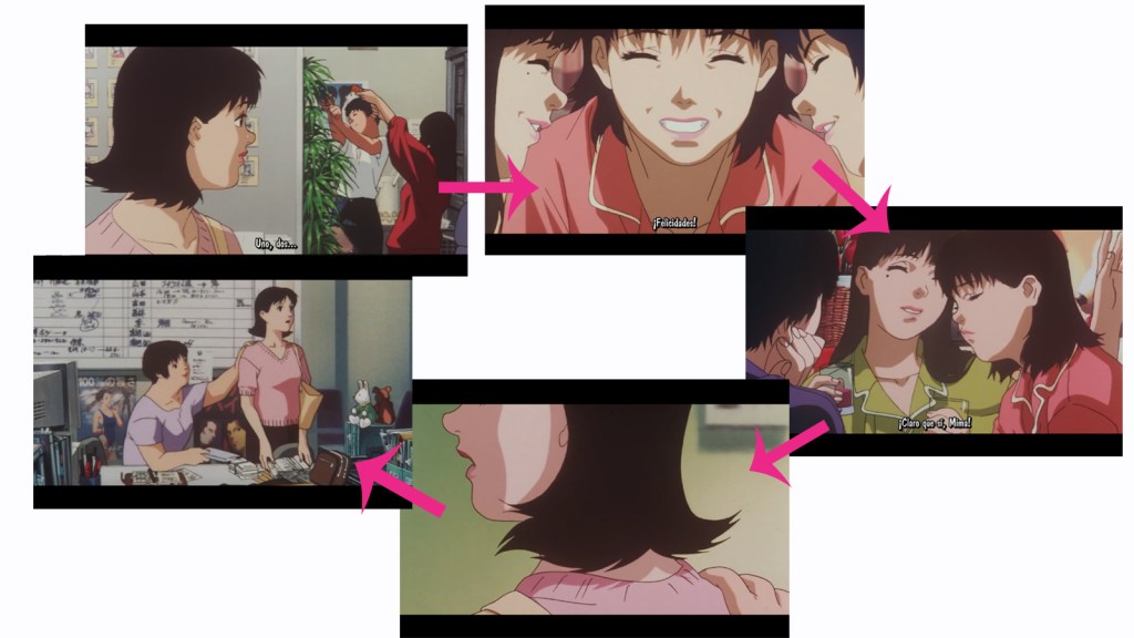 Kon utilizó repetidamente la similitud de los movimientos de los personajes para conectar los fragmentos de diferentes tiempos y espacios, y en unos minutos explicó el entorno principal de la película y los personajes.