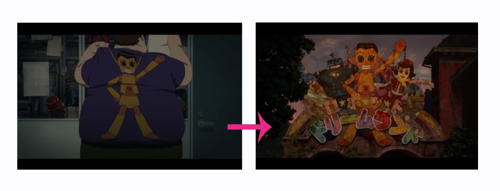 En Paprika, desde el plano de la imagen de robot de la camiseta Dr. Kosaku Tokita, hasta el plano de los robotes grandes en la entrada de parque de atracciones.