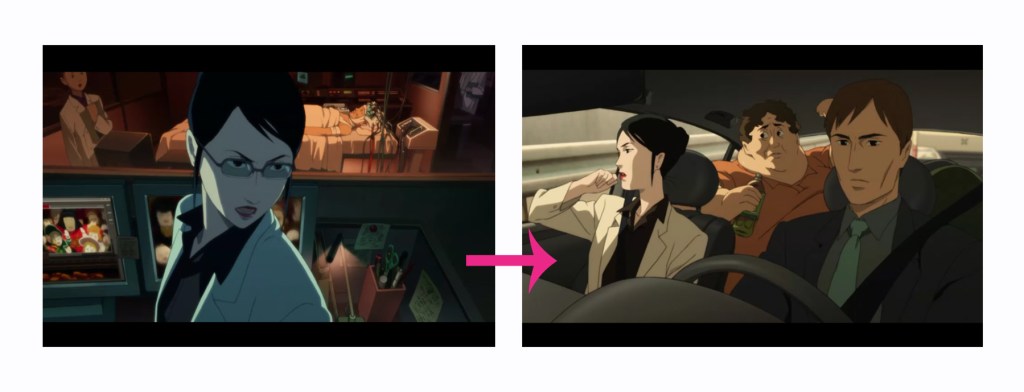 En Paprika, el plano antes es que Atsuko, Dr. Kosaku Tokita y Dr. Morio Osanai conocen Himuro por tener la gran sospecha, Atsuko les pregunta: ¿Dónde está Himuro? El siguiente plano es que las tres personas están de camino e ir a la casa Himuro. Para realizar la transición natural de las diferentes escenas.