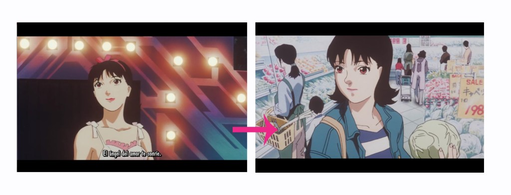 En “Perfect Blue“, del plano que Mima está entrevistado de TV, al siguiente plano que es la imagen de Mima de la revista.