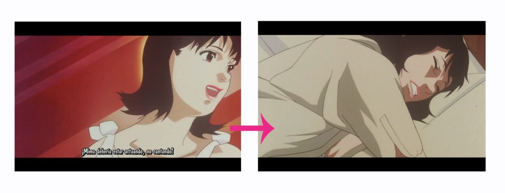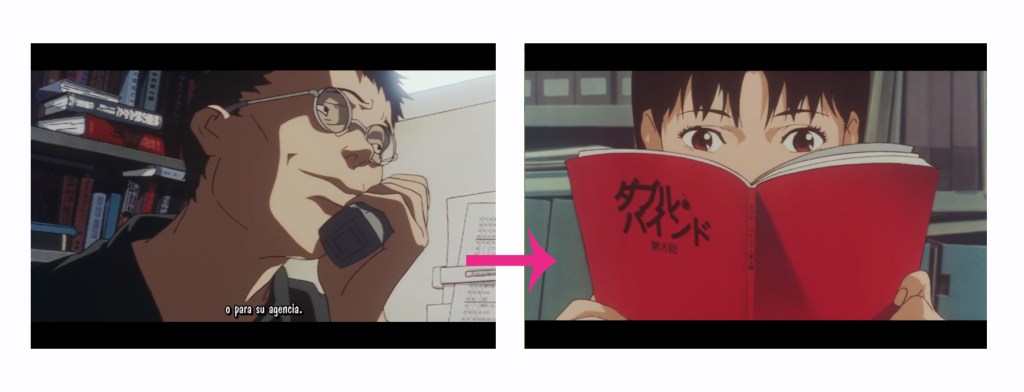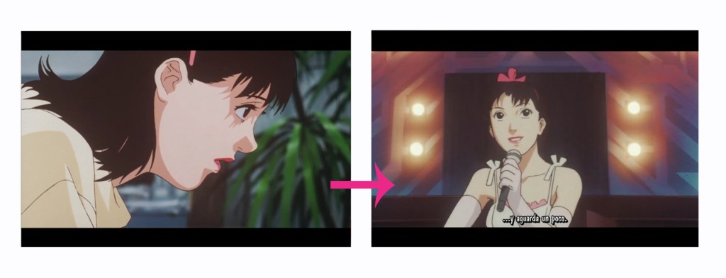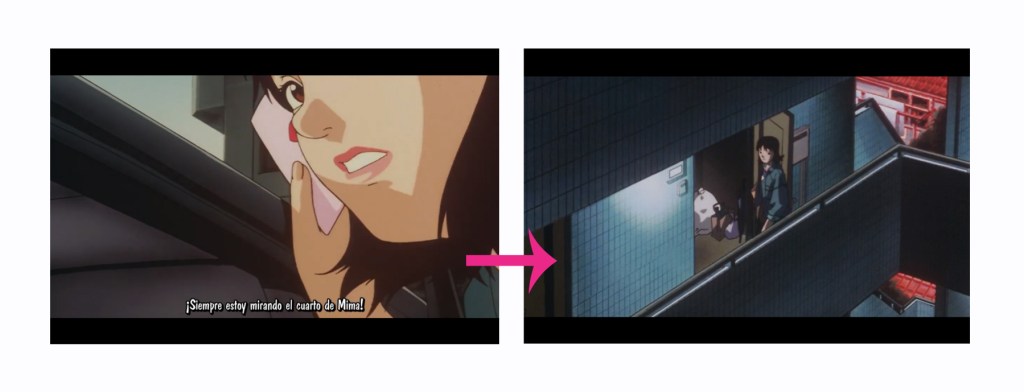 En “Perfect Blue“, el plano antes es que el guionista está llamando al productor, preguntando la cosa de Mima. El siguiente plano es que Mima está leyendo el guión en la empresa.