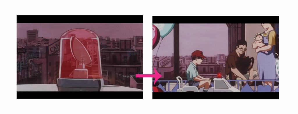 Por ejemplo, en “Perfect Blue“, el guionista se murió, Voz en off es el sonido de sirena, el siguiente plano es que un chico está jugando el juguete de vehículo policial.