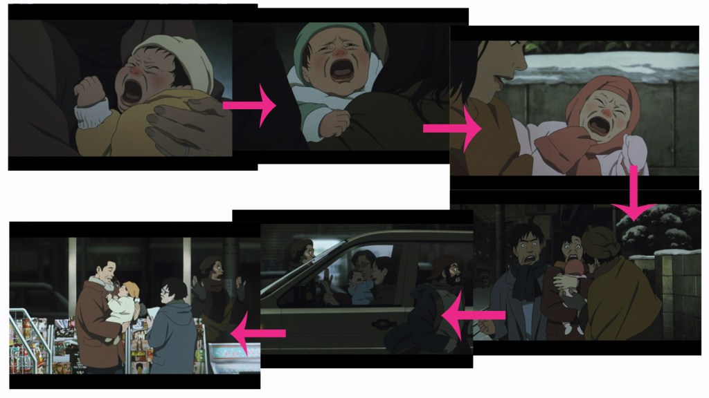 Y en “Tokyo Godfathers“, el plano delante es que Kiyoko está llorando en un parque, y en los siguientes planos son que los diferentes bebés, Voz de off es el sonido llorando de Bebé, los tres protagonistas están buscando Kiyoko con ansia. Los personajes en diferentes espacios están más estrechamente conectados debido a un sonido similar. También es efectivo usar la misma música de fondo para cambiar escenas.